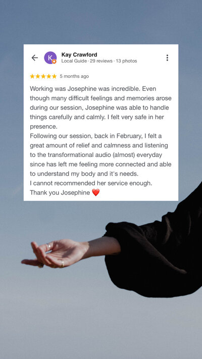 “My experience of Josephine has always been nothing but positive. I always feel listened to and respected by her and I appreciate that Josephine really helped me to understand that I can find the root cause of my feelings. I’ve learnt to get rid of things that don’t serve me. Something I use regularly is the idea of visualising moving the anxiety out of my body. Josephine you’ve really shifted my mindset and I feel like such a different person, all because of you!!! Thank you for all of the help and dedication.”