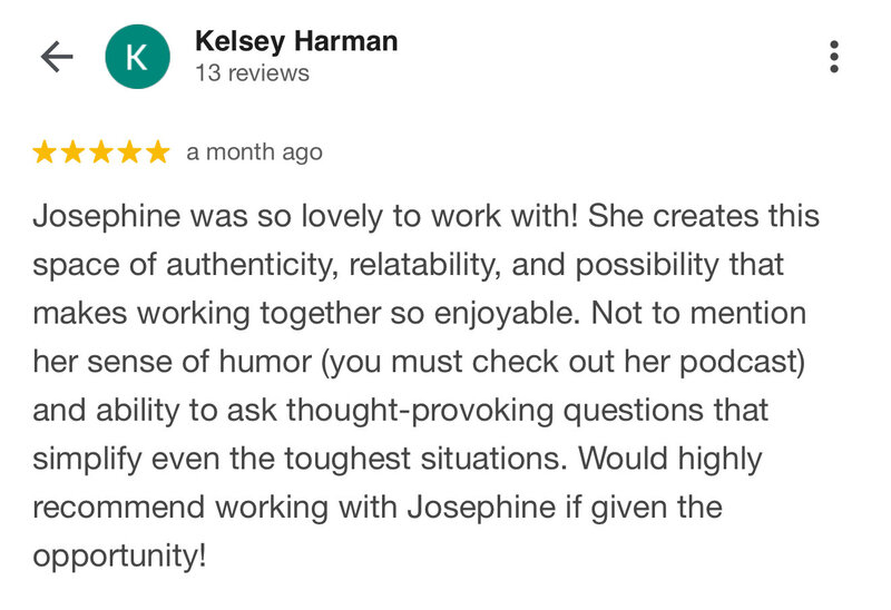 “Working with Josephine helped me learn to navigate and understand my own emotions instead of taking them out on myself and others. I learned how to change my belief systems which helped me be able to see myself lovingly without feeling the deep hatred I did before.